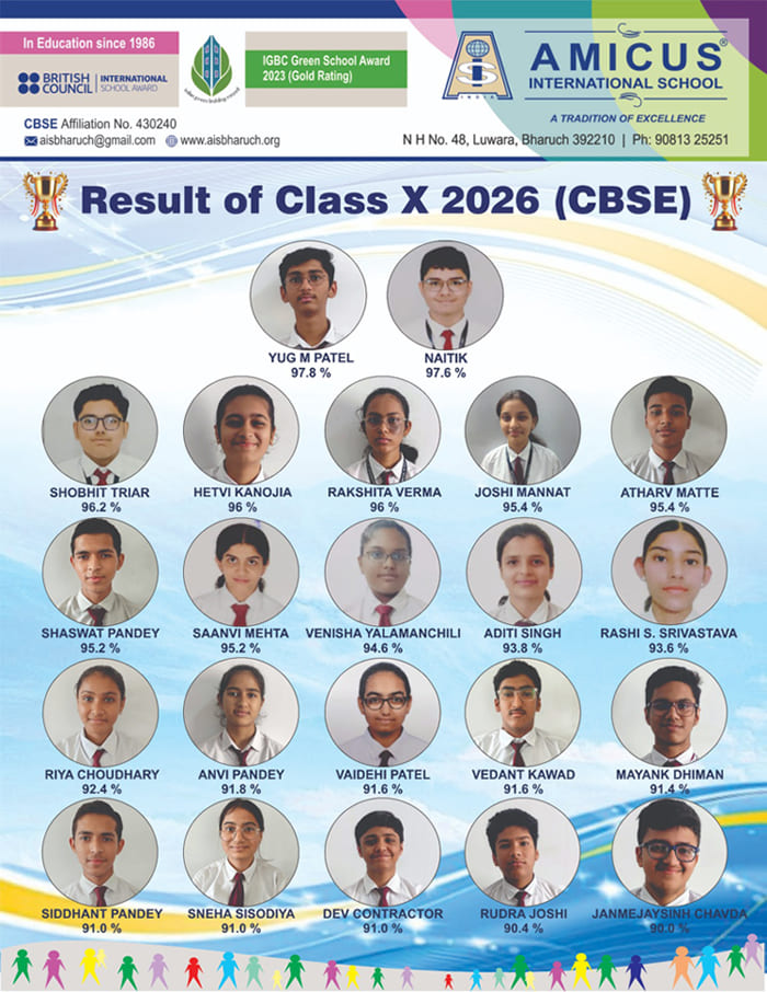 Welcome to Amicus International School, Bharuch; where education is envisioned as a transformative journey towards excellence and character. Our vision is to cultivate intellectually capable, ethically grounded, and socially responsible learners who are prepared to meet global challenges with confidence and integrity. Through a balanced blend of academic rigor, innovation, and holistic development, we strive to nurture leadership, creativity, and lifelong learning. At Amicus, we are committed to creating an inclusive environment that empowers every student to realise their potential and contribute meaningfully to society.